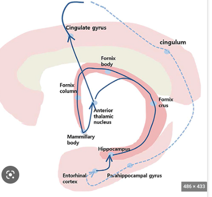 Cingulate cortex –> parahippocampal cortex –> hippocampus –> fornix –> mamillary bodies –> hypothalamus -> anterior thalamus –> cingulate cortex.