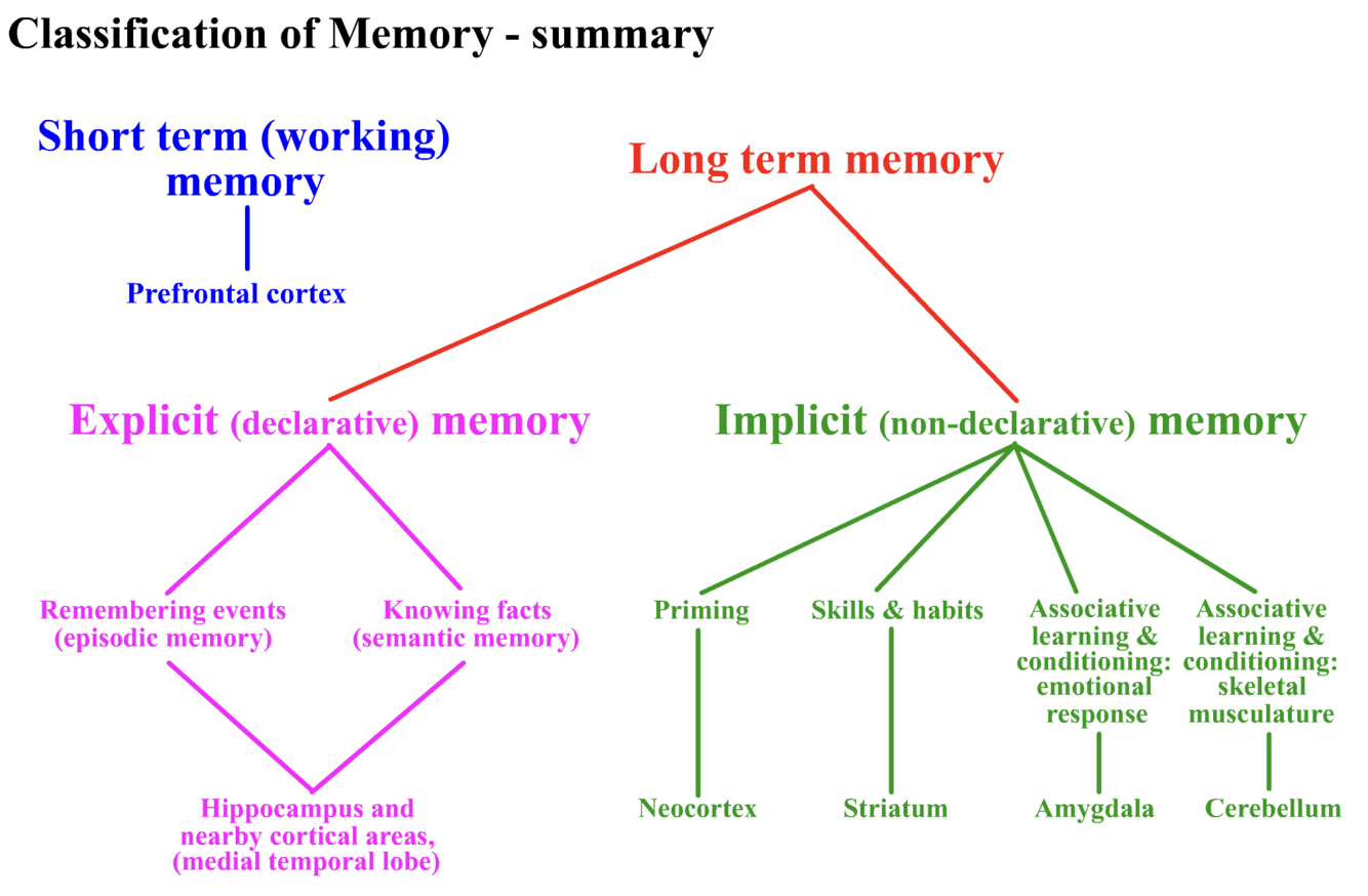 Long term memory subdivided into declarative and procedural memory.