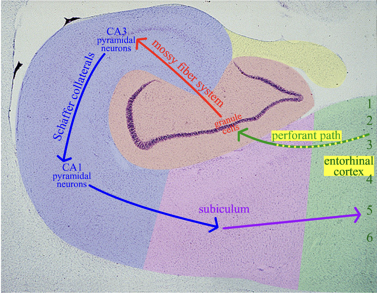 2) Dentate gyrus granule cells via mossy fiber system ⟾ CA3 pyramidal neurons