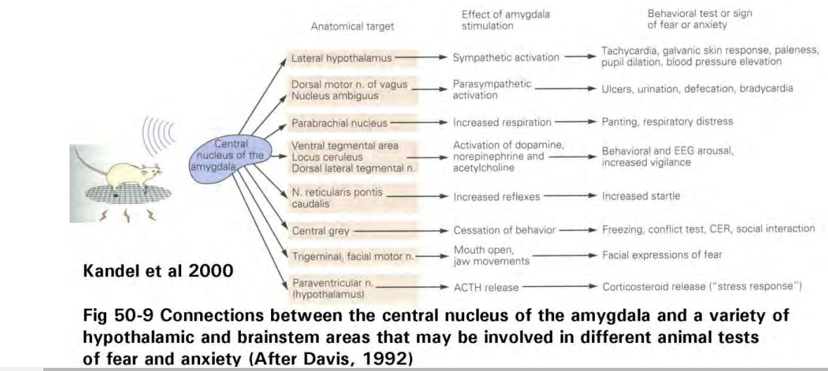 Amygdala outputs control many of the manifestations of emotional behavior, especially via the hypothalamus and sympathetic activation.
