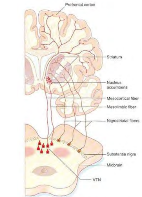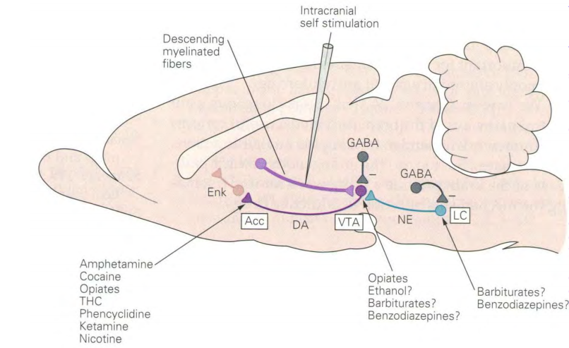 Brain reward circuitry involves a dopaminergic pathway from the ventral tegmental area (VTA) (ventral midbrain) to the enkephalinergic neurons in the nucleus accumbens (ACC).