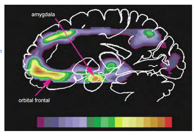 Cerebral blood flow in the amygdala and orbital frontal cortex is elevated in patients with major depressive disorder (MDD) compared to controls. This suggests some aspects of depression are dependent upon the amygdala.