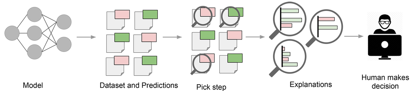 In model evaluation; certain representative predictions are selected to be explained to the human by an “explainer” like LIME