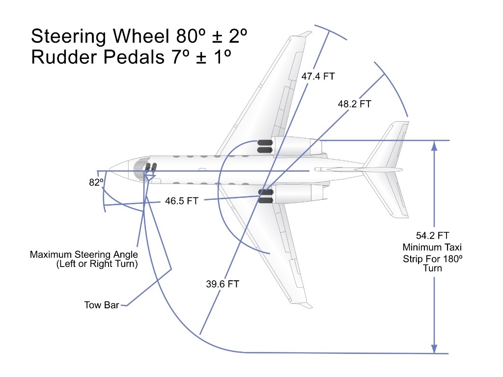 ‘What is the min taxi strip width to make a 180° turn (based on a max nose wheel deflection of 80°+2°)?