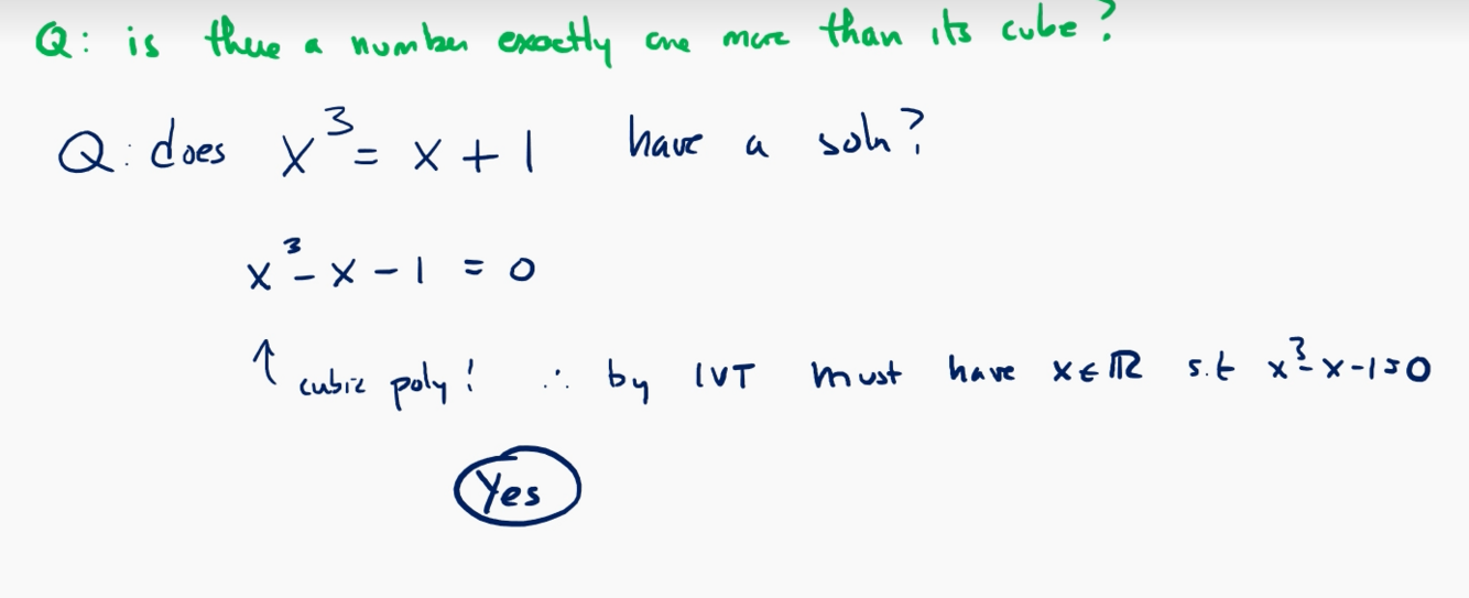 Due to intermediate value theorem, know that all polynomials cross x axis at least once, so there is a solution to that equation equals zero