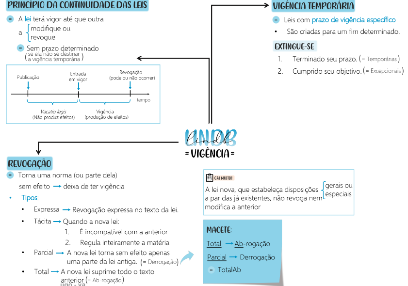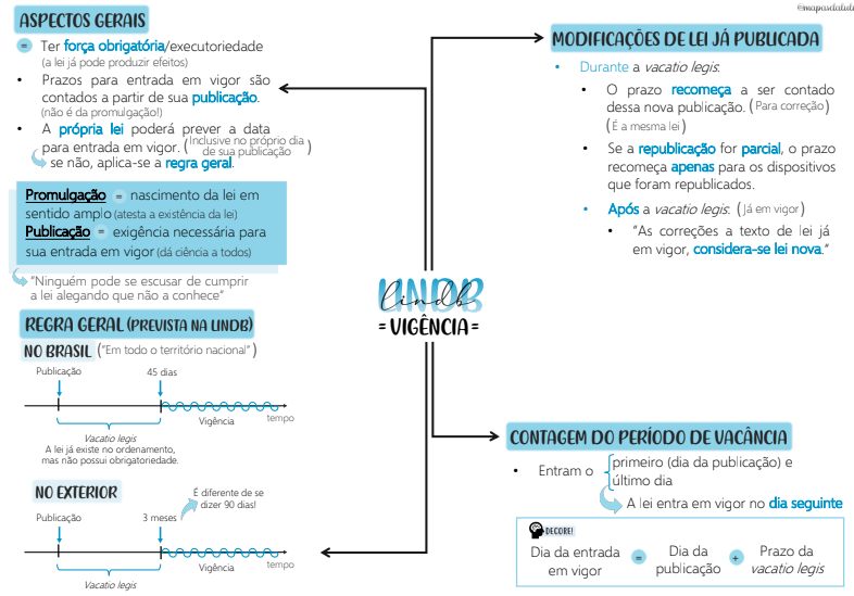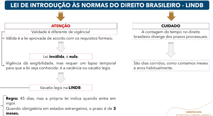 * Assim, a vigência da norma respeita a vigência nela mesma estabelecida. De maneira quase tautológica, a lei vige quando diz que vige. Legislações mais complexas têm vacatio legis maior, como o CPC/2015 ou o CC/2002 (um ano); se um pouco mais simples, prazo menor, como o Estatuto da Pessoa com Deficiência – EPD (180 dias).