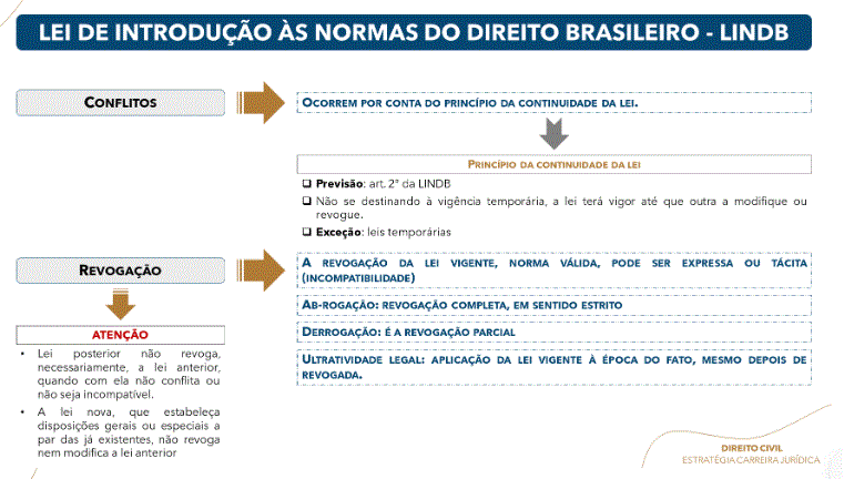 Essas são situações peculiares, portanto. Em regra, a vigência se apaga apenas com a revogação da norma. A revogação, no entanto, não precisa ser expressa, pode ser tácita. A lei posterior revoga a anterior também quando seja com ela incompatível ou quando regule inteiramente a matéria de que tratava a lei anterior, estabelece o art. 2º, §1º da LINDB.