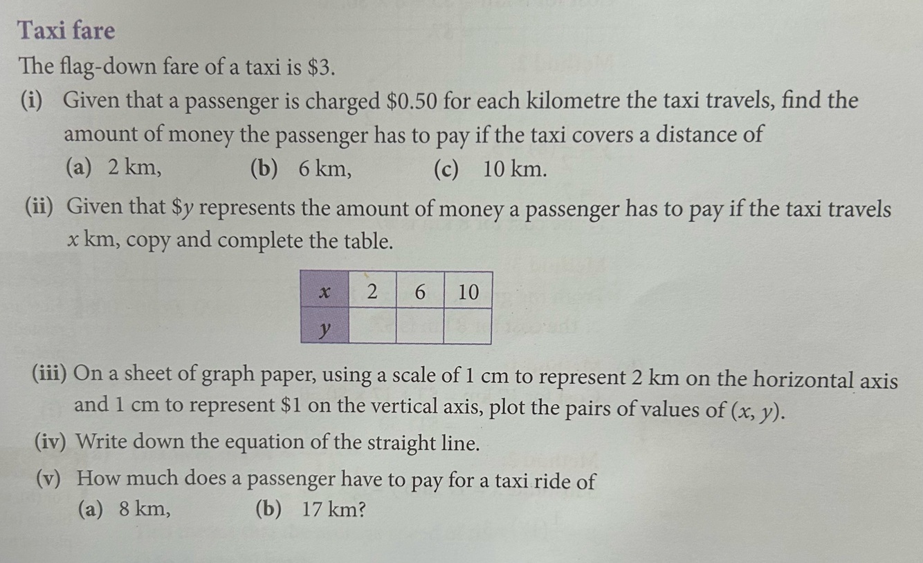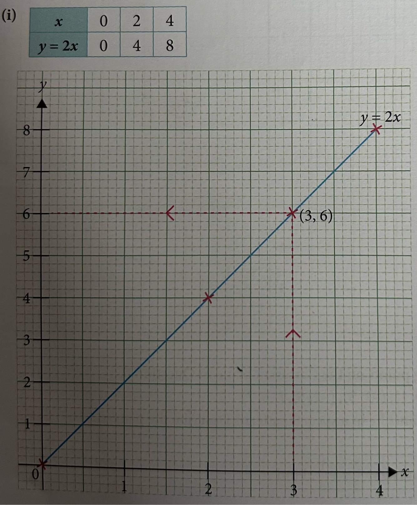 (i) On a sheet of graph paper, using a scale of 2 cm to represent 1 unit on the x-axis and 1 cm to represent 1 unit on the y-axis, draw the graph of the function y = 2x for values