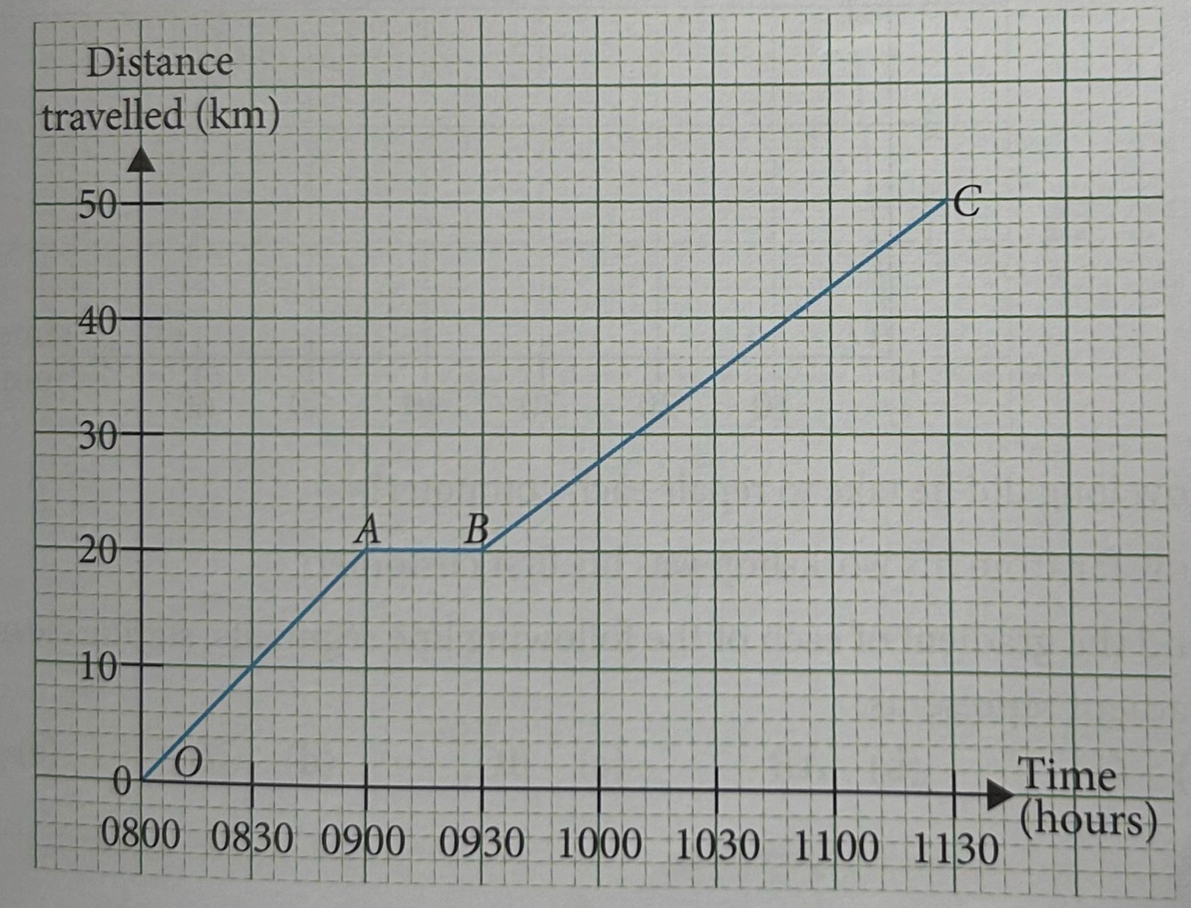 The travel graph shows a journey taken by a cyclist. He started his 50-km journey at 0800 hours. At 0900 hours, he spent half an hour replacing a punctured tyre. He then continued his journey and reached his destination at 1130 hours.
