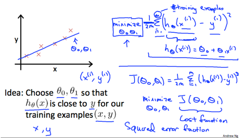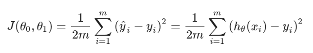 Takes an average difference of all results of the hypothesis with inputs from x and the output y.