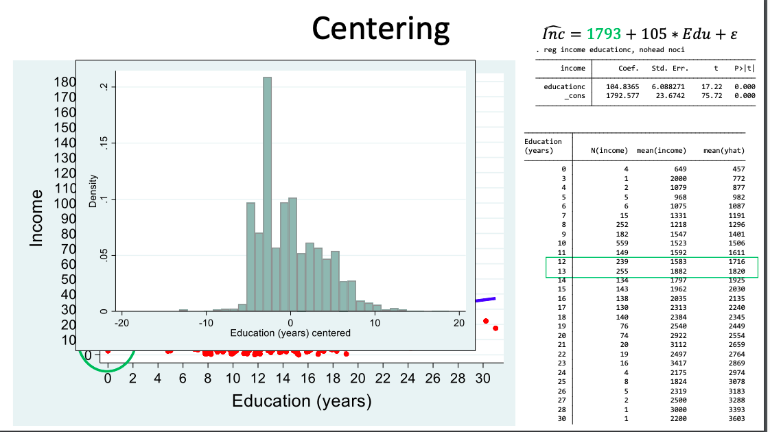 centering: usually mean centered (subtract -12,5 years from years of education)