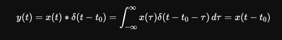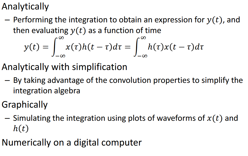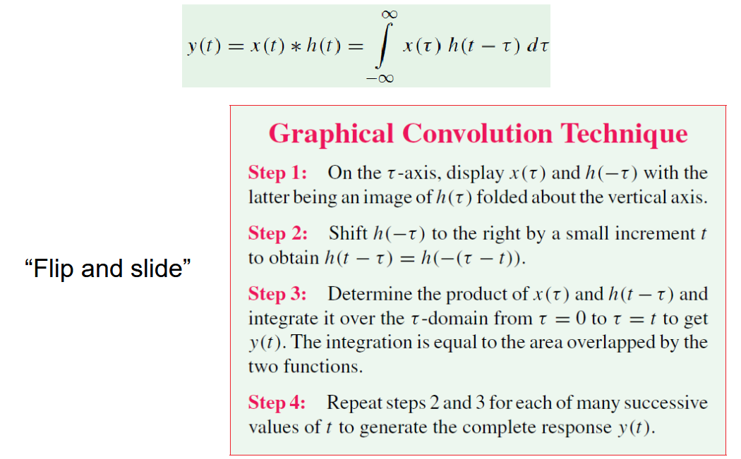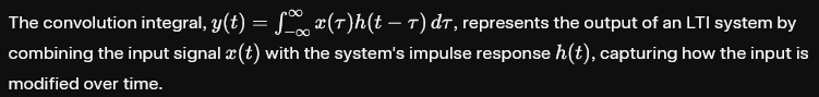 It can be mathematically expressed as: 𝑦(𝑡) = 𝑥 ∗ ℎ(𝑡) = ∫𝑥(𝜏)ℎ(𝑡−𝜏)d𝜏.