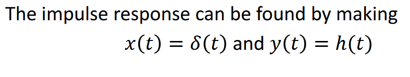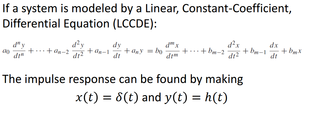 Fill in the blank: The impulse response of a Linear, Constant-Coefficient, Differential Equation (LCCDE) can be found by making 𝑥(𝑡) = ______ and 𝑦(𝑡) = ℎ(𝑡).