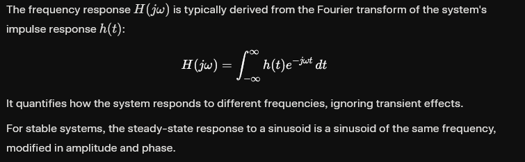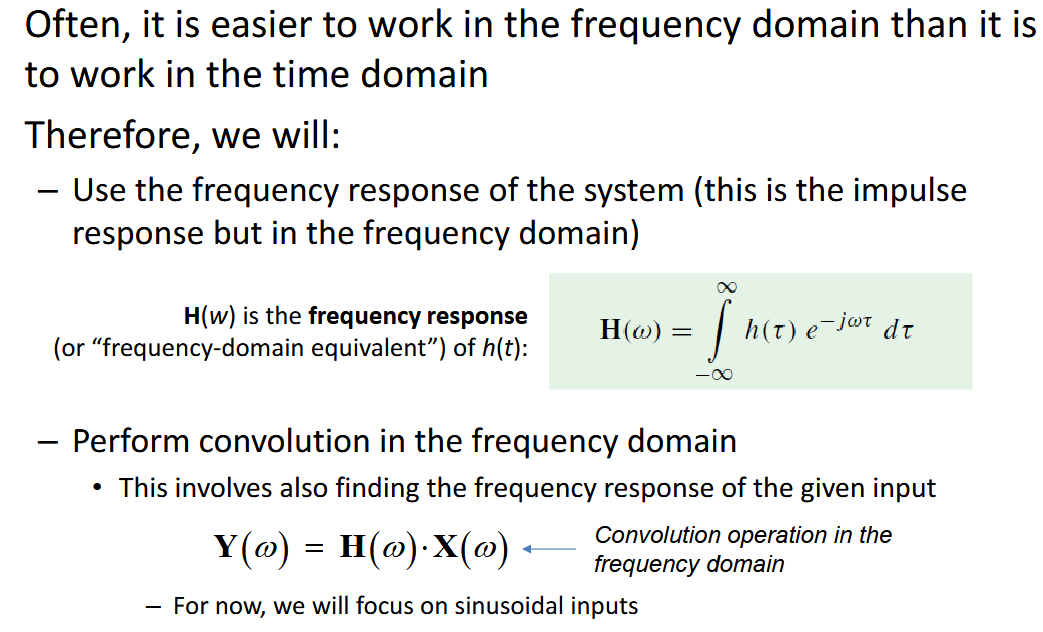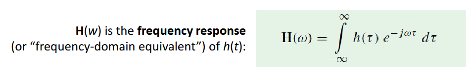 The frequency response is the impulse response but in the frequency domain, denoted as H(ω).