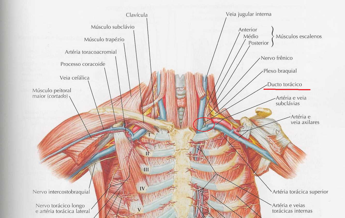 Ducto torácico na junção da veia jugular interna esquerda com a v. subclávia esquerda