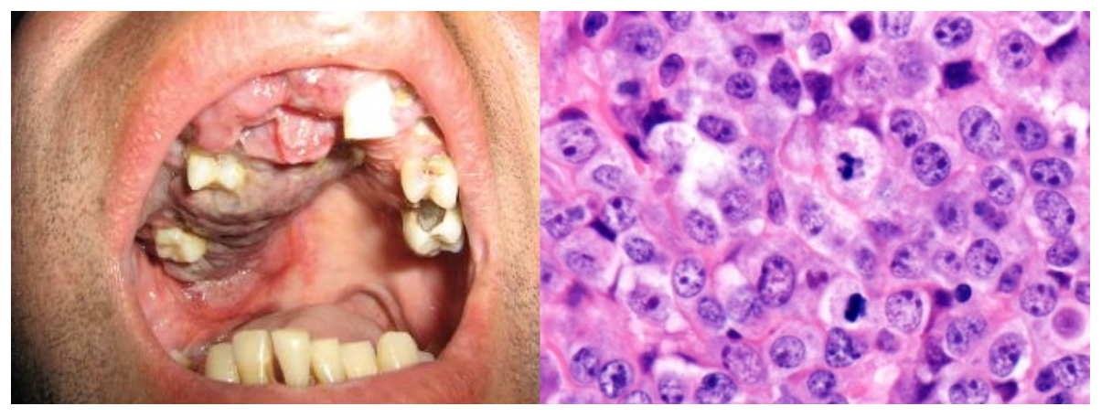No histopatológico, observa-se infiltrado difuso contituído por células grandes (imunoblastos-like) e células com diferenciação plasmocitária. Figuras de mitose são frequentes.