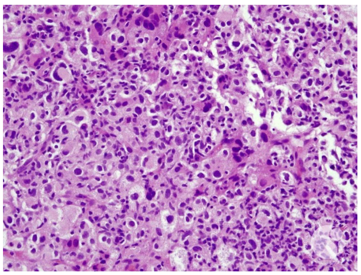 No anatomopatológico, observa-se infiltrado difuso constituído por grandes células, podendo ser indistinguível do linfoma difuso de grandes células B.