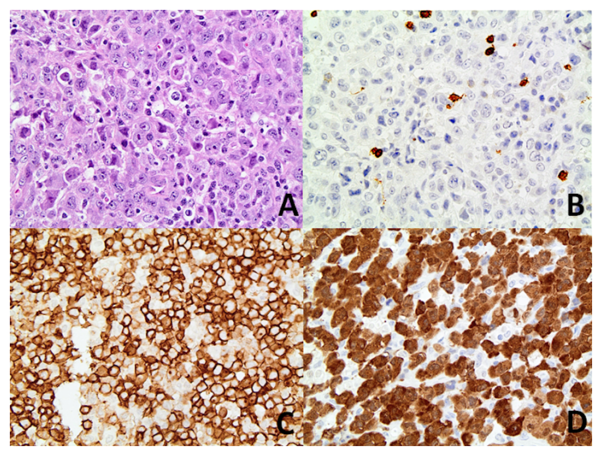 A ausência de PAX5 e CD15 é um dado importante no diagnóstico diferencial com linfoma de Hodgkin, uma vez que podem estar presentes células Reed-Sternberg-like.