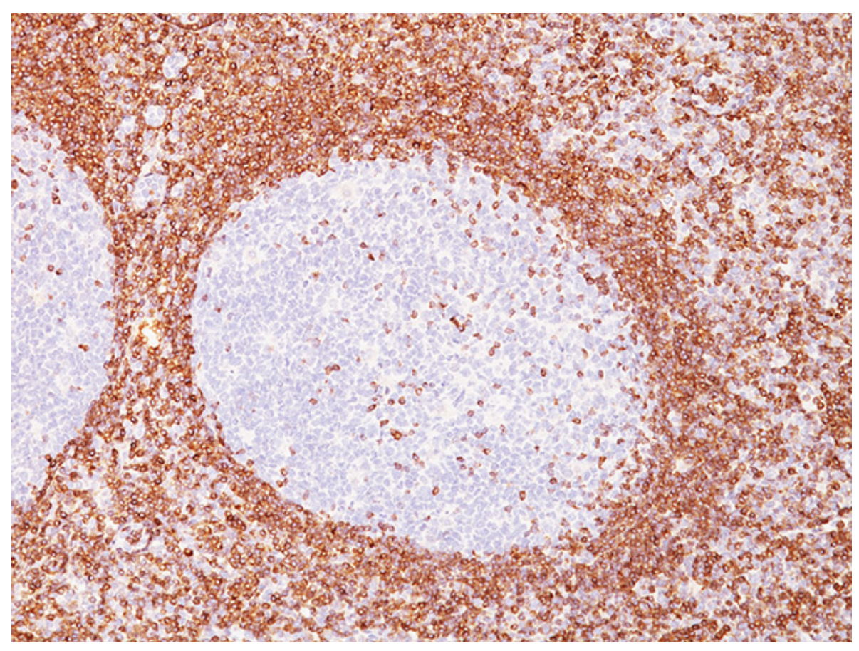 No folículo linfoide secundário NORMAL, qual marcador apresenta o seguinte padrão na imunohistoquímica (mostrado abaixo)?