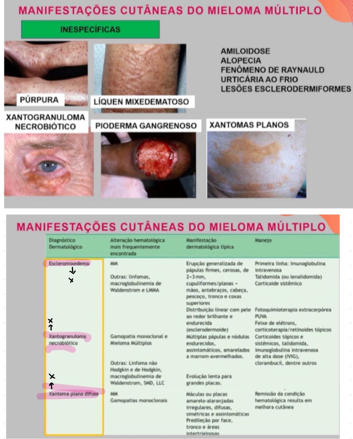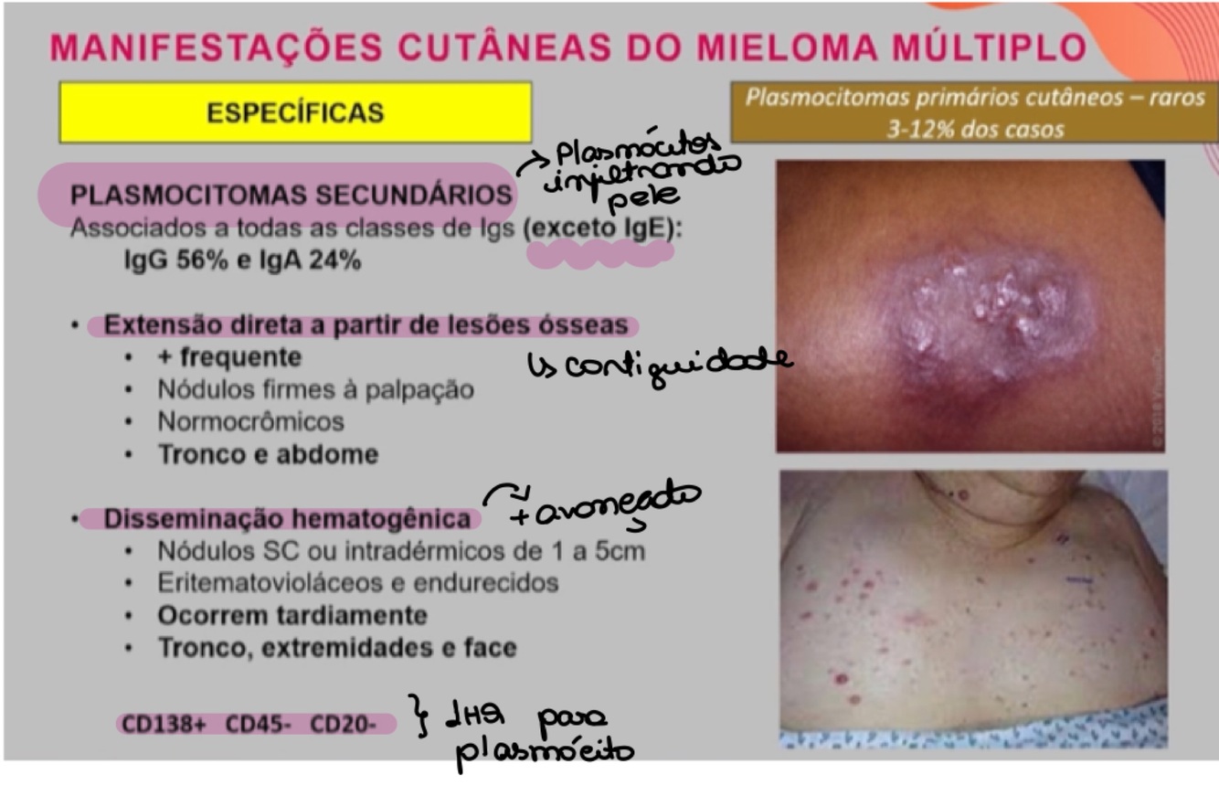 Quais doenças cutâneas são frequentemente encontradas em pacientes com mieloma múltiplo?