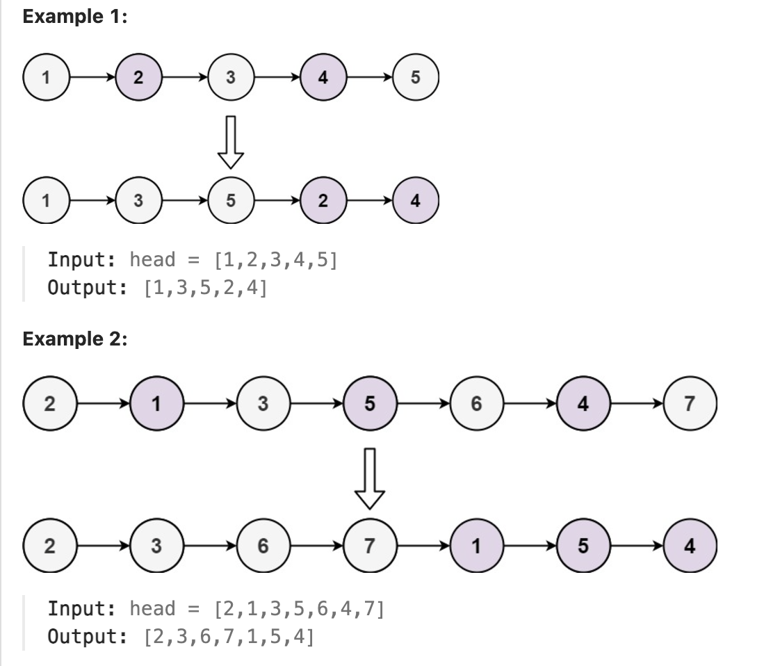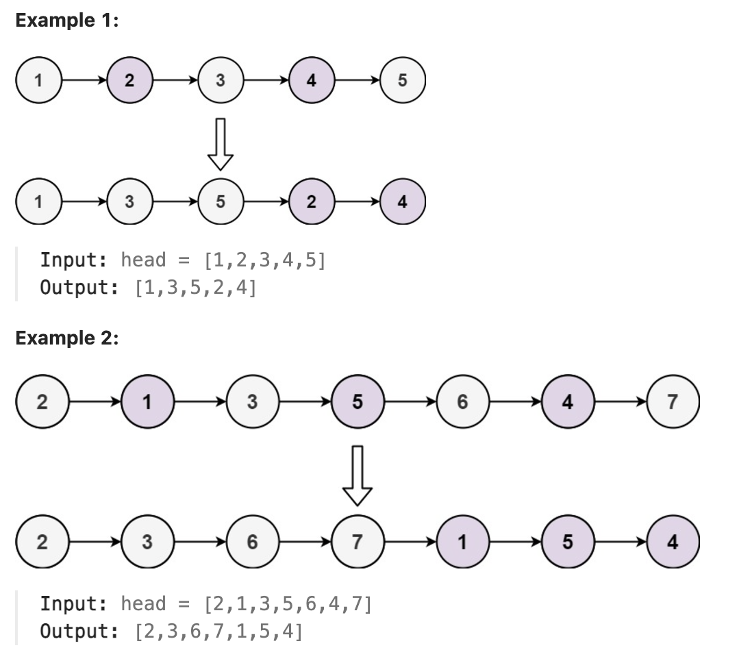 Dummy Head Initialization: Two dummy head nodes, odd and even, are created. These nodes serve as the starting points for two separate lists: one to collect all nodes from odd positions and the other for nodes from even positions. This is a common technique used to simplify list manipulation by avoiding dealing with special cases for the head node.