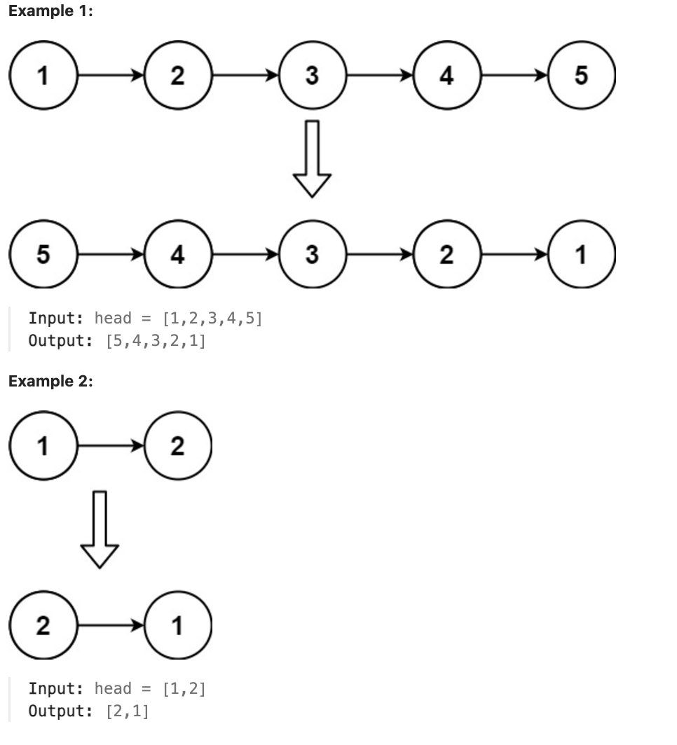 While traversing the list, we can change the current node’s next pointer to point to its previous element. Since a node does not have reference to its previous node, we must store its previous element beforehand. We also need another pointer to store the next node before changing the reference. Do not forget to return the new head reference at the end!