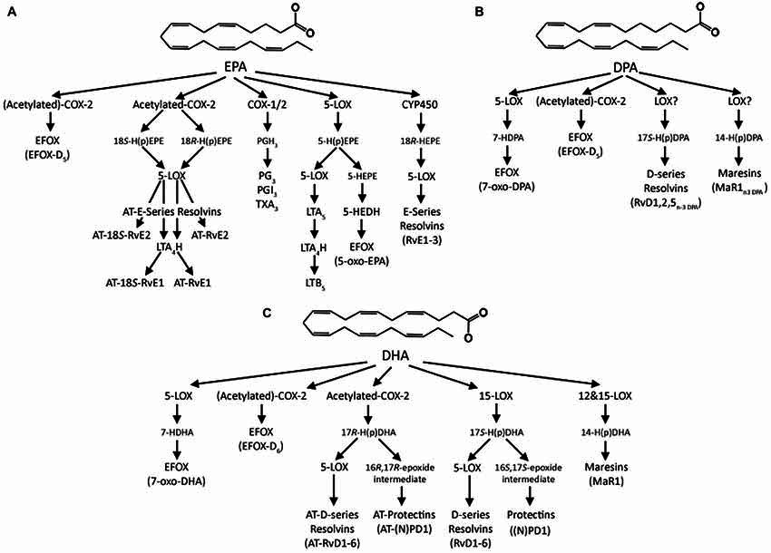 Omega-3 fatty acids that may be metabolized into pro-resolving lipid mediators, including resolvins and protectins.
