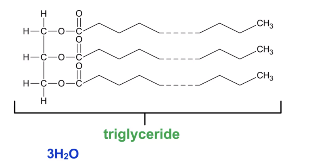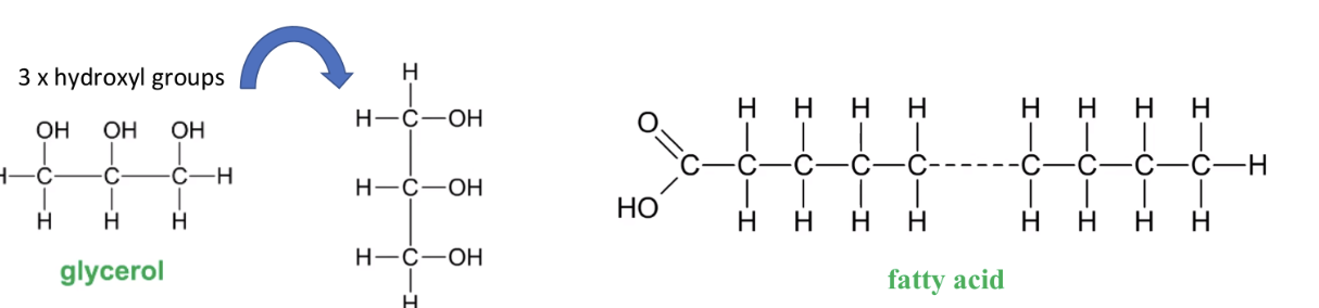 The hydroxyl groups interact leading to the formation of three water molecules and three bonds between the fatty acids and glycerol molecule.