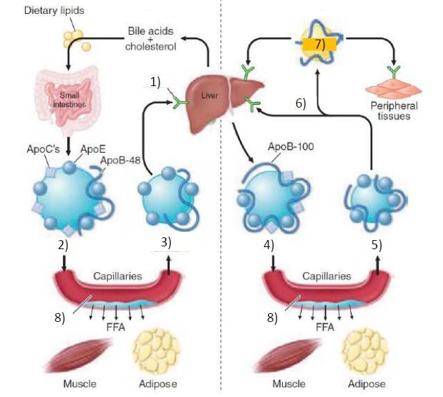 Hepatic lipase (6) Hydrolyses TAGs in IDL turning it to LDL.