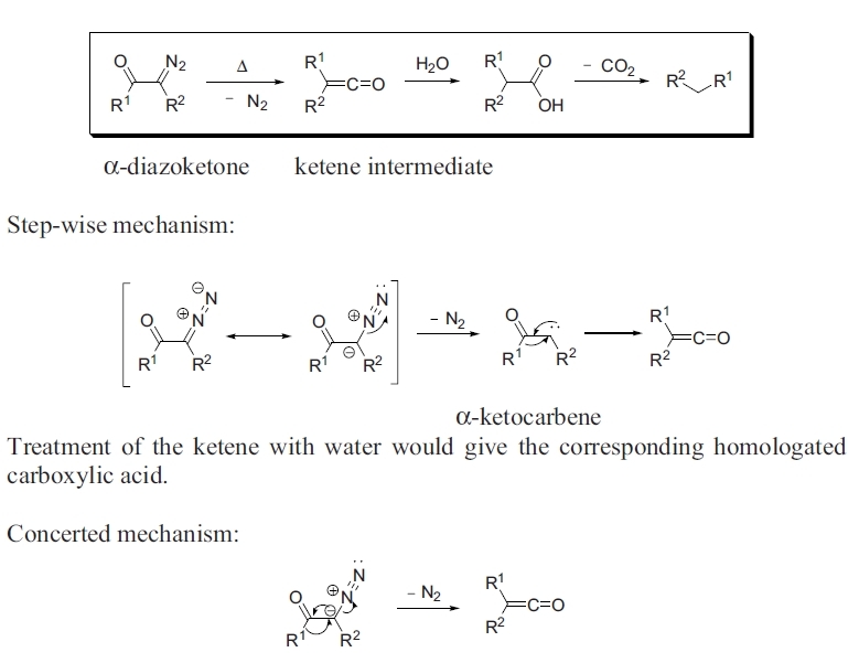 α-重氮酮去氮生成烯酮再水解成羧酸并最终脱羧成烷烃