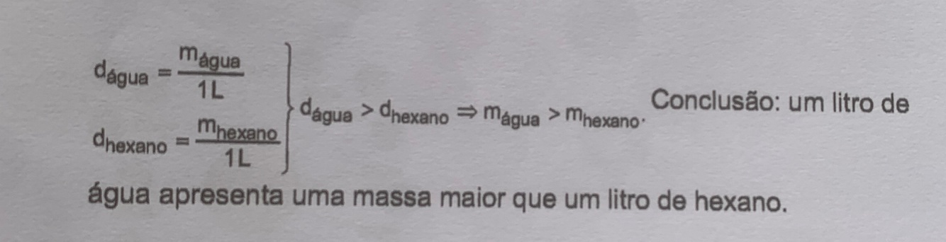 T or F: um litro de água apresenta uma massa maior que um litro de hexano