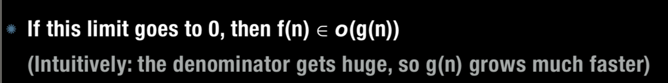 When dividing f(n)/g(n) if this limit goes to zero, what does this mean?