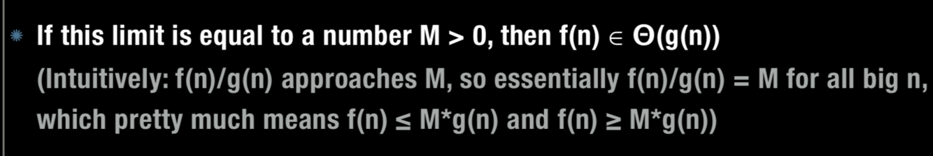 When dividing f(n)/g(n) if this limit goes to a number M > 0, what does this mean?