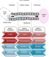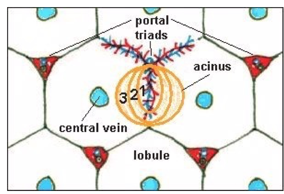The territory of an acinus has, as its axis, one final branch of the portal vein and is subdivided into 1. periportal- deals with sampling blood components and accordingly changes composition , 2. intermediate and 3. perivenous where blood gets enriched