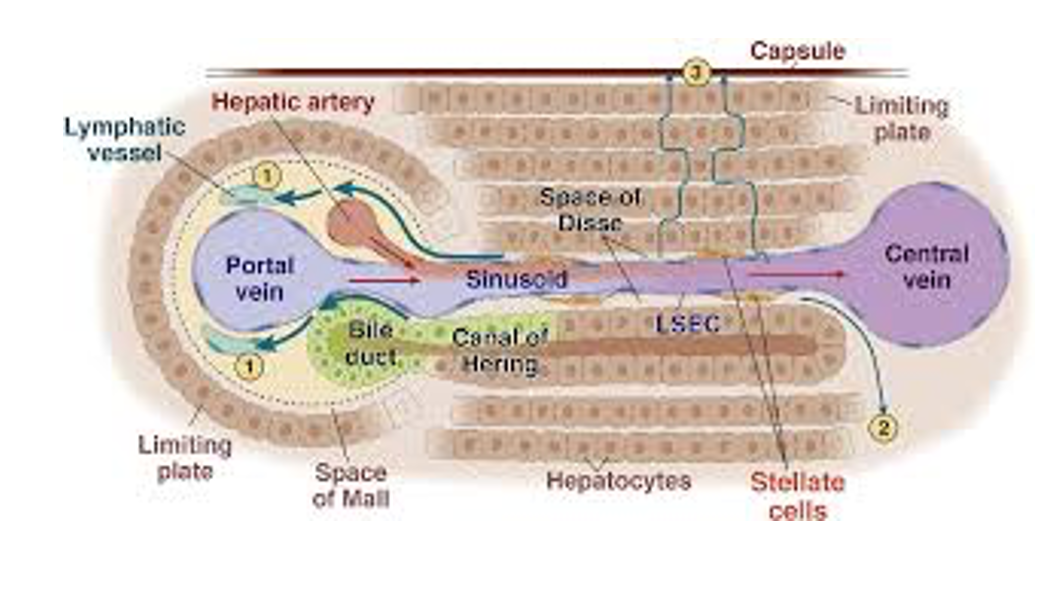 Hepatic blood flow= from branches of portal vein and hepatic artery on the periphery to the central veins via the sinusoids