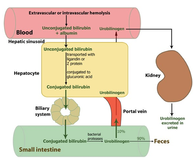 If there is high levels will be turned to unconjugated the liver will turn it to conjugated and it will either go into the billary system to the small intestine and faeces or excreted in the urine