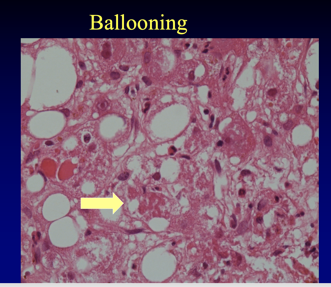 Histopathology shows spottynecrosis (small foci of inflammatiton and infiltrates)