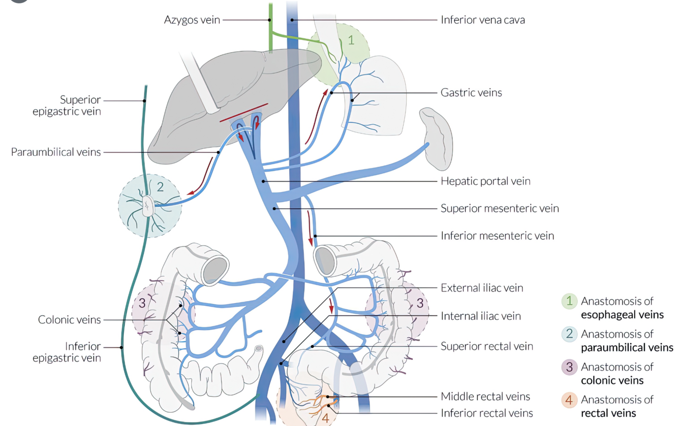 Distortion of liver vascular architecture (obstruction of blood flow) –> inra- and extra-hepatic shunting of blood (no filtration of blood)