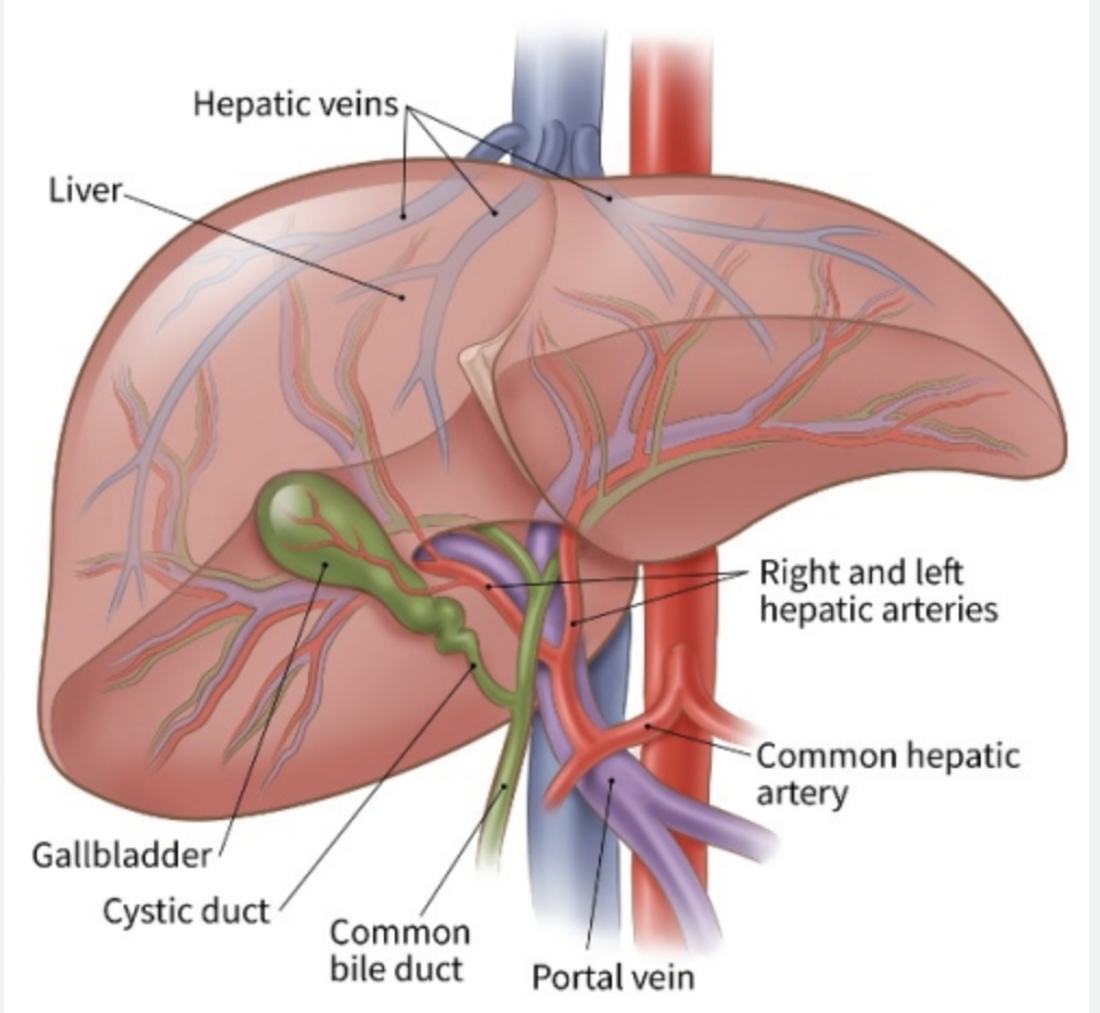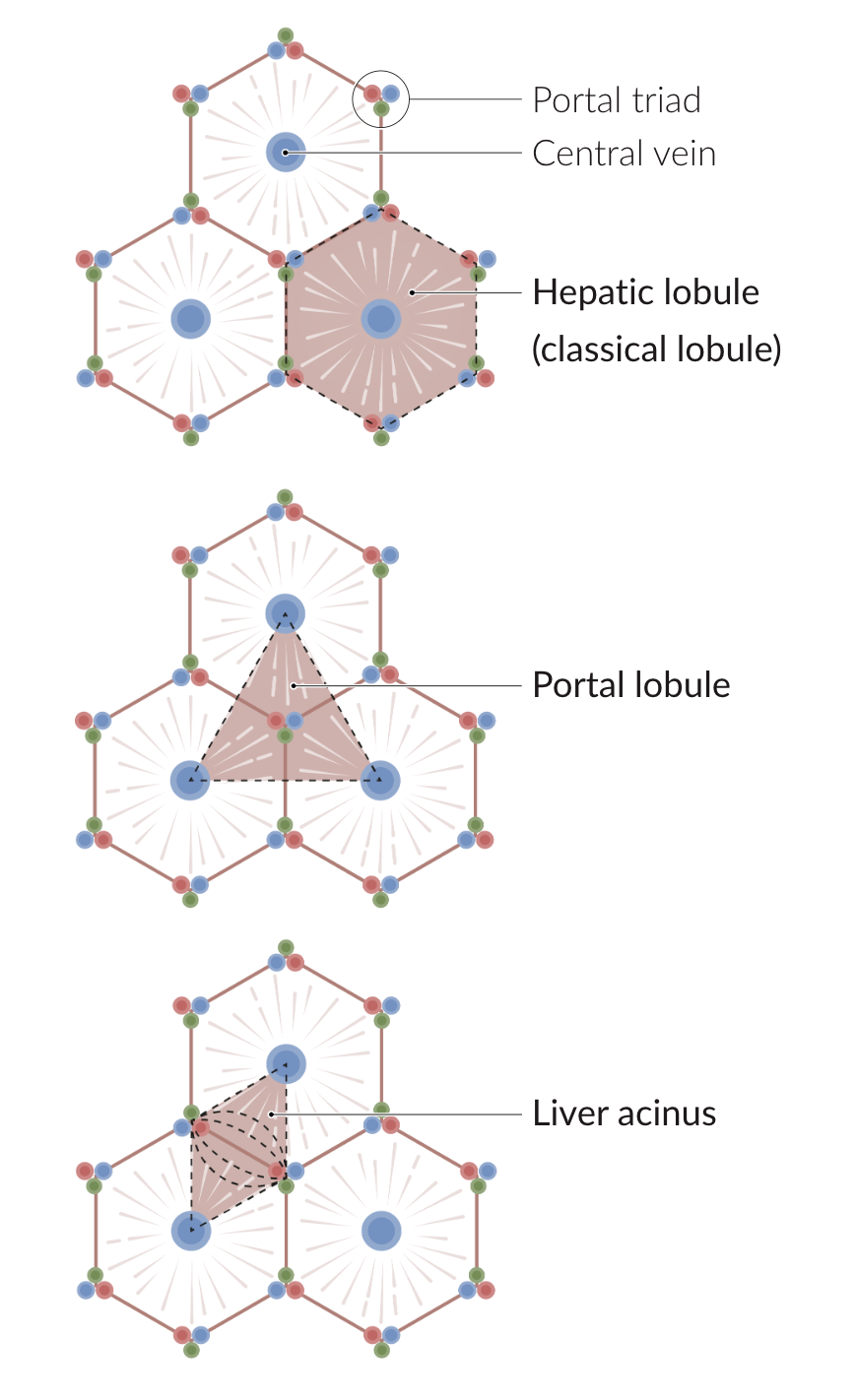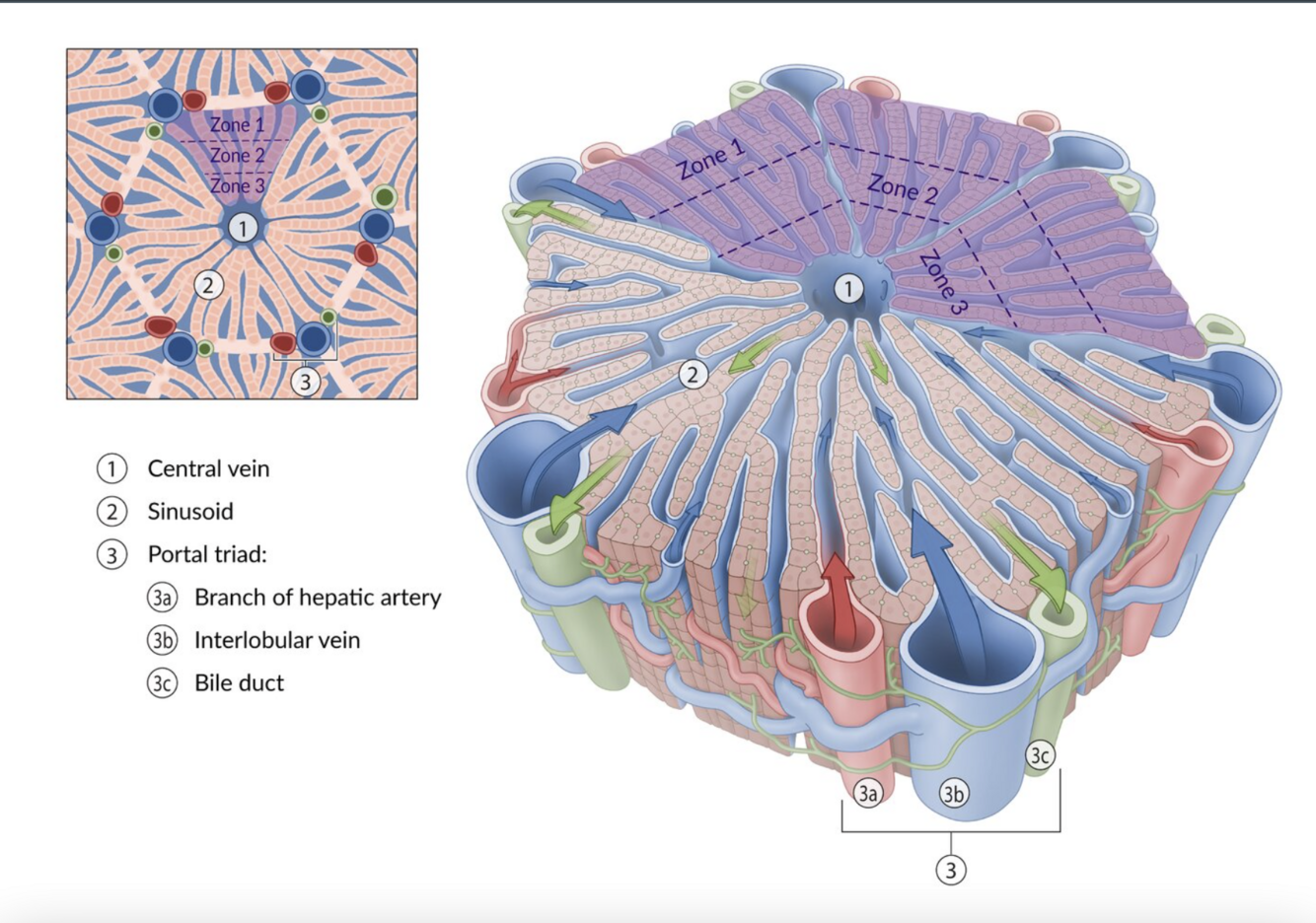 –> Blood flow and filtration from portal triad to central vein, bile flow in opposite direction