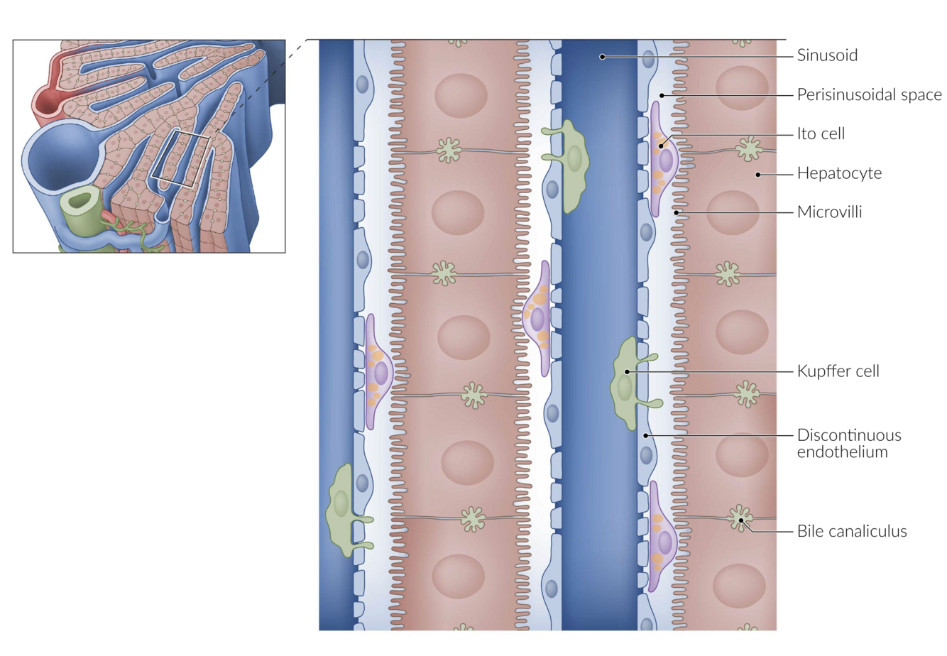 Kupffer cells (a type of macrophage) are housed in the sinusoids