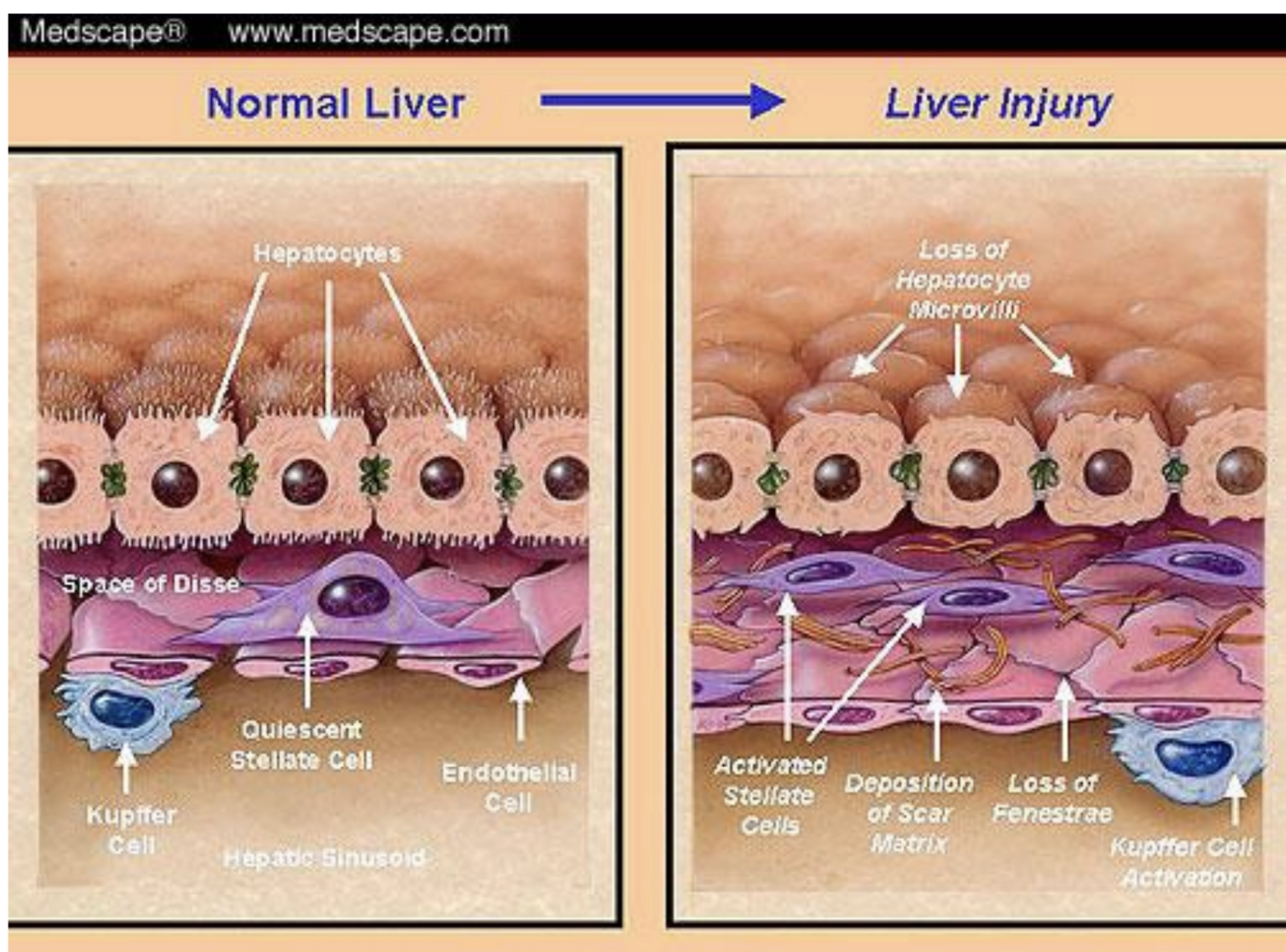 Can get activated –> become myofibroblast –> and are the main source of extracellular matrix production in liver injury (formation of scar tissue → fibrosis)