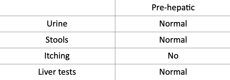 Describe urine, stools, itching and Liver tests in Pre-hepatic Jaundice