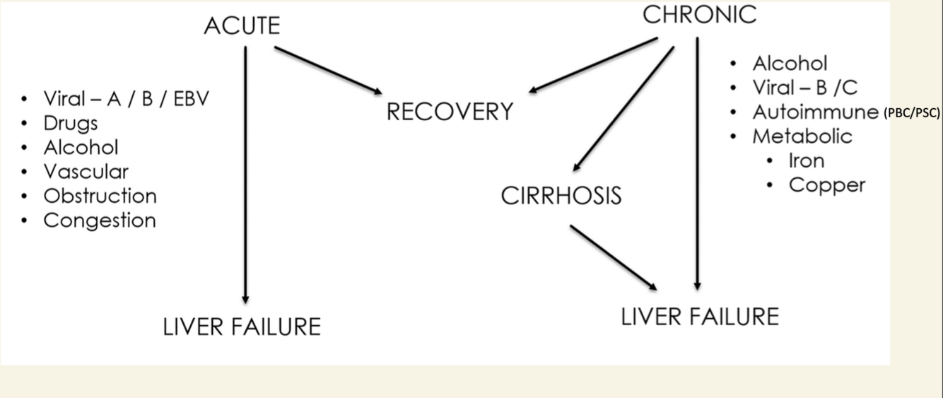 Describe the progression of Acute and Chronic Liver Failure