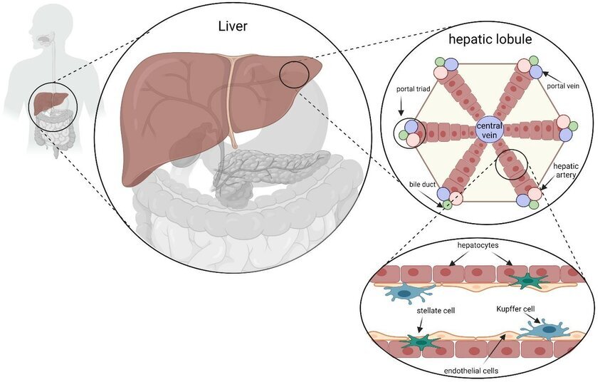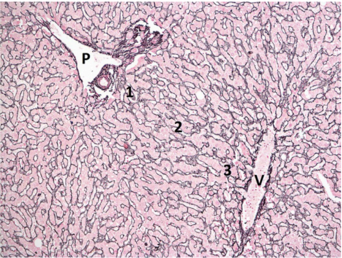 Four regions of the hepatic lobule on histology include portal triad –> zone 1 –> zone 2 –> zone 3 –> central vein