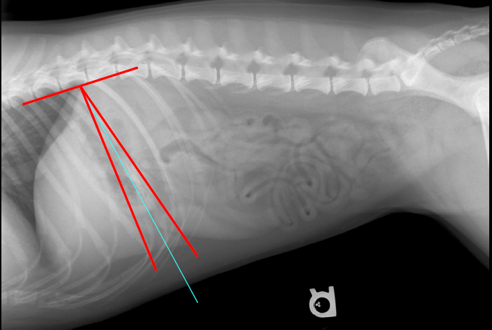 On ventrodorsal view the gastric axis is located over the ____ thoracic vertebrae