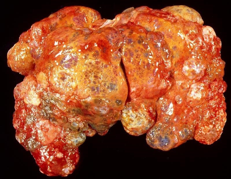Multifocal to coelescing black irregularly shaped (3cm across) lesions can be seen on the surface of this liver and also present on the cut surface.