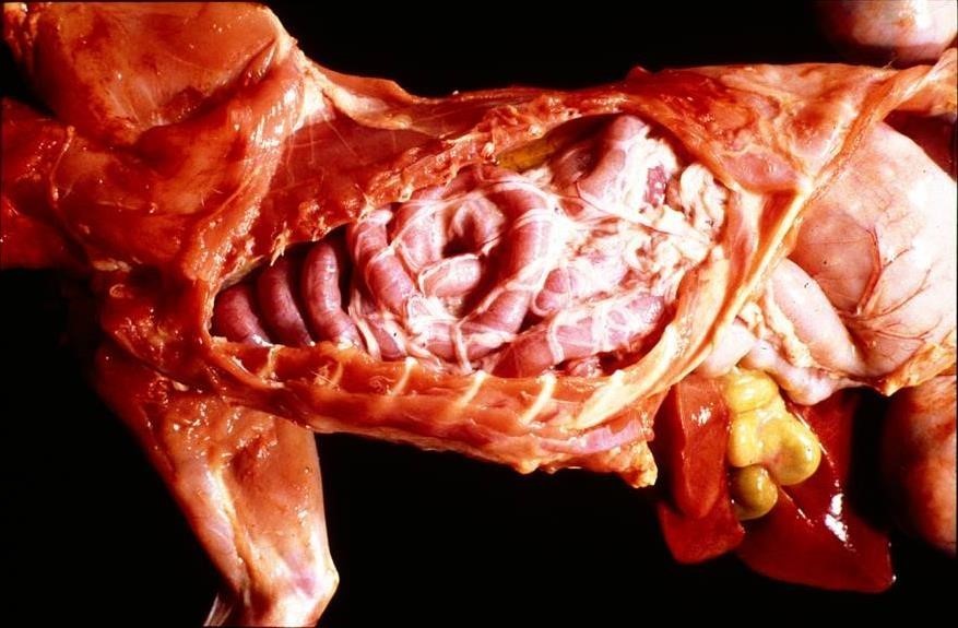 The normal anatomy of the thorax and abdomen of this cat has been severely disturbed, with the small intestine and other abdominal viscera being displaced cranially, presumably through the diaphragm.