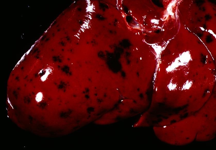 The parenchyma of the liver shows disseminated round black lesions with non-affected tissue showing either redenning or multifocally shown to be pale tan. The surface of the liver is diffusely roughened.