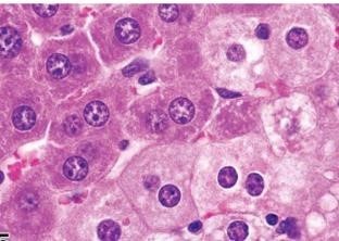 Right of the image - hydropic degeneration of hepatocytes due to influx of Na+ and H2O