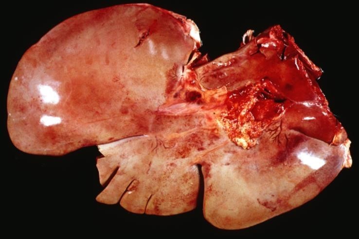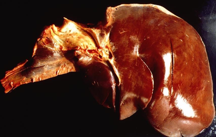 The surface and deep tissue is focally extensively pale tan, with about 80% of the hepatic tissue being affected. The tissue itself is extremely friable when touched.